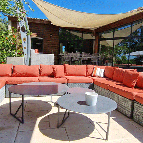 Une seconde terrasse avec salon pour s’y reposer ou prendre un verre ou autre… Elle est dotée d’un parasol déporté qu’on fermera par temps de pluie ou par grand vent.